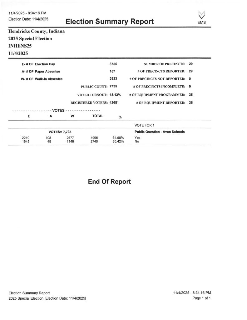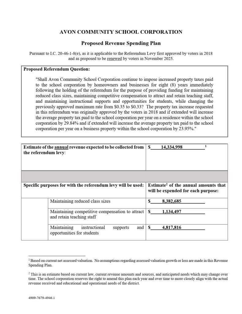 Shall Avon Community School Corporation continue to impose increased property taxes paid to the school corporation by homeowners and businesses for eight (8) years immediately following the holding of the referendum for the purpose of providing funding to maintain reduced class sizes, maintain competitive compensation to attract and retain teaching staff, and maintain instructional supports and opportunities for students, while changing the previously approved maximum rate from $0.35 to $0.33? The property tax increase requested in this referendum was originally approved by the voters in 2018 and if extended will increase the average property tax paid to the school corporation per year on a residence within the school corporation by 29.84% and if extended will increase the average property tax paid to the school corporation per year on a business property within the school corporation by 23.95%. – via Hendricks County Election Board