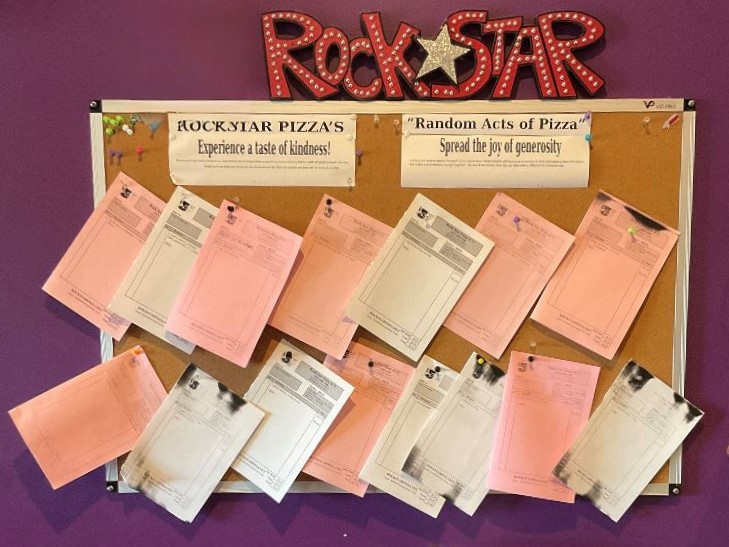Rockstar Pizza has a pay it forward wall, where donations become traditional order combinations. One large pizza, sandwich and salad bar, or some other combination. Order types change frequently. They ask that you please stop by their restaurant, as the kitchen staff in the back (those who answer the phones) have no knowledge what’s available each day. The board is nothing new, Rockstar and their supporters have been doing this for nearly 3 years.