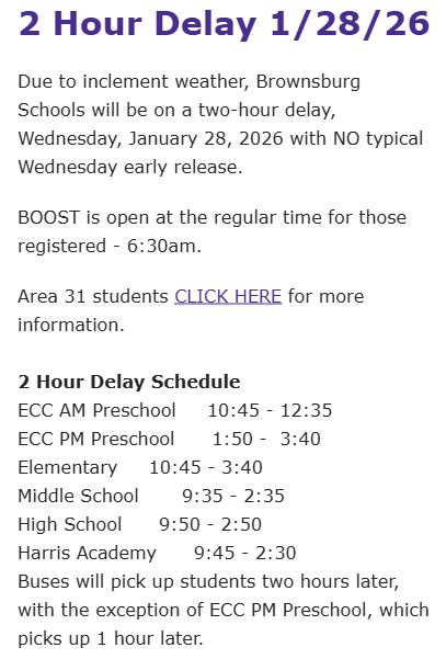 Due to inclement weather, Brownsburg Schools will be on a two-hour delay, Wednesday, January 28, 2026 with NO typical Wednesday early release.